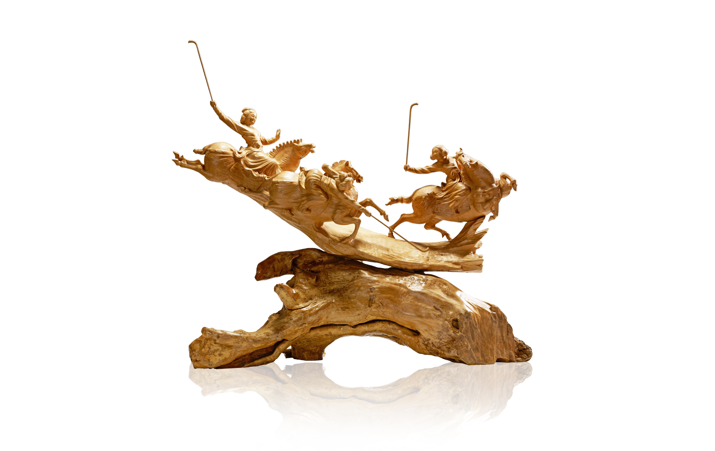"Juju" is a popular outdoor sport in ancient times, commonly known as "playing polo". It was especially popular in the Tang Dynasty, and noble women's polo teams often appeared on the court. The woman's sabre is a symbol of "do not allow a woman to wear eyebrows" and is also a symbol of rights and status. The bold design of the work demonstrates the passion and arbitrariness of women's juju contest. The horse's running posture and the woman's sabre movement are all portrayed as vivid and interesting.