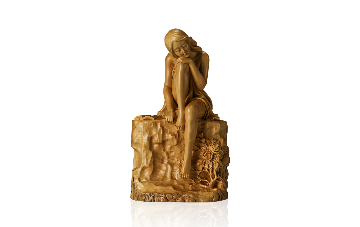 At noon, a woman sat quietly and rested, a book spread out quietly, and several flowers bloomed brightly. She has long hair shawls and slightly closed eyes, and the facial features are portrayed in a natural and natural manner. The women's arms and legs are undressed, and most of them are exposed outside, showing a beautiful posture. In the portrayal of the body, it is biased towards the carving of nude figures in Western style, which has a bright and moving beauty.