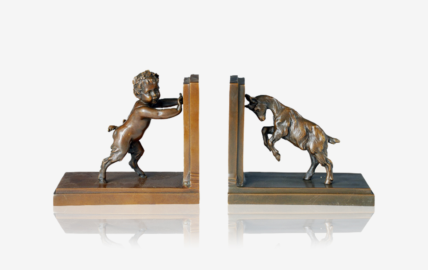 常规的“书挡”都是成对出现,作品《助推》采用了两幅作品,左边刻画了一个半兽人形象的小男孩在用力推,右边刻画了一只羊在用头顶住,一推一顶,恰好突出了“书挡”的作用。