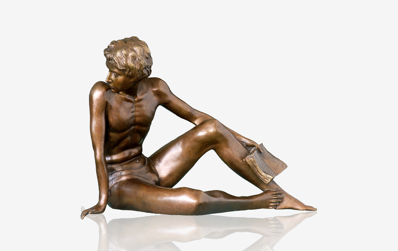 《回首》刻画了一个男性型男的形象,从男子的穿着来看,像是在家中,比较自然随便,袒露着上身,因此男性的胸肌、腹肌也清晰可见,体现了西式美学中倡导的体型美。而从男子回头的动作来看,仿佛是妻子回家的声响惊动了他。与此同时,男子挺直了背,作为书挡之用,不得不让人拍案叫绝。