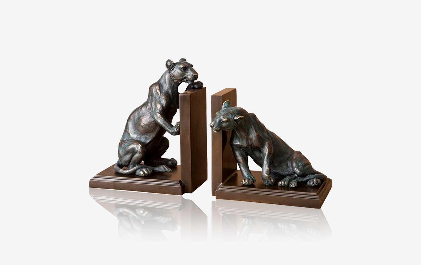 “窥探”原指的是暗中观察,而在鸿鑫雕塑的雕刀下,两只豹子正以不同的姿态互相“窥探”,其中一只是趴着往下看,另外一只是靠着往外看,小心翼翼又充满情感。二者作为书挡成对出现,正是为人刻画出一幅生动有趣的画面。