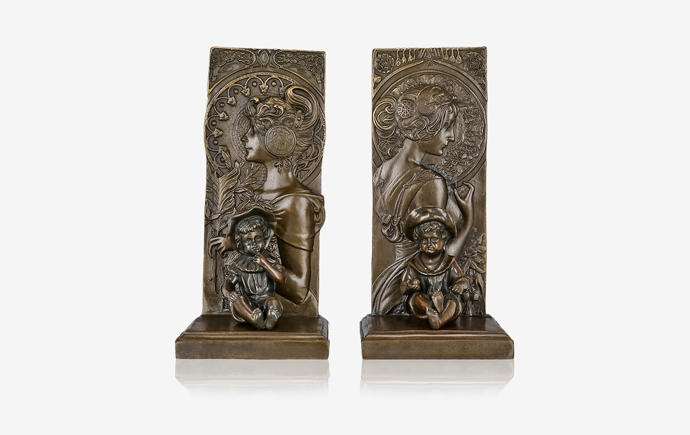“孩子”代表着希望与未来,因此在西方的很多雕塑作品中,我们随处可见孩子的踪影。鸿鑫雕塑以孩子为主角,创作了两幅相同主题、不同形态的书挡作品,作品中一个小孩摸着下巴,一个小孩手里拿着食物,其背后的不同成年女性分别采用不同的欧式装饰元素,体现出作品的多元性,同时也以孩子、美女烘托主题。