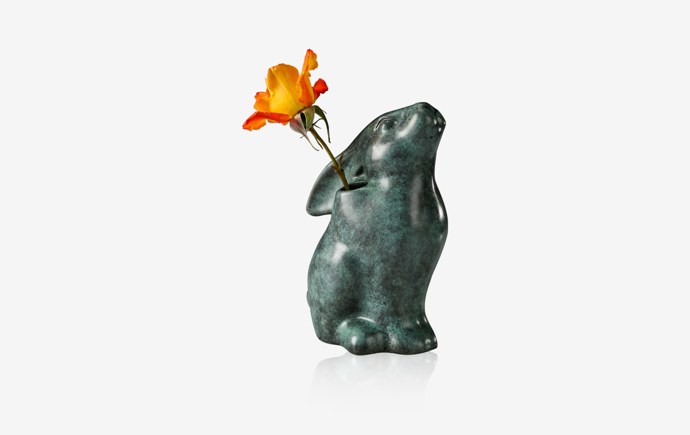 作品介绍:作品的主题是一只仰天而时的兔子,身体采用的是墨绿色的设计,与兔子仰天的结合,表达出一种沉稳的形态。整个设计较为简单大方,看似普通,仔细一看反映了作品艺术还是有一定的高度的。