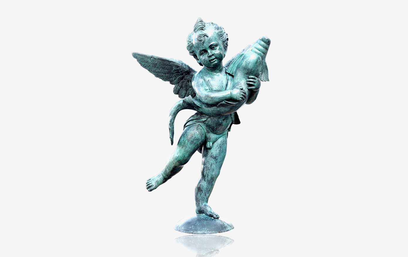 这是一件欧式的人物铜喷泉雕塑。这件作品主要雕刻了一个可爱淘气的小天使。他正抱着一条差不多有自己一半身高长的海鱼,单脚站立着。小天使的肥脸和肉肉的身形,这些质感雕刻得十分地细腻自然,彰显出了孩子的可爱。而他的头发纹路和翅膀上的羽毛的复杂的排列,也显示了雕刻者扎实的雕刻功底,既使得作品非常的精细,又能够与其他部位相协调,使得整体构造上非常地活泼自然。整座雕塑非常富有生机和动感,令人一见便能心生喜爱之情。