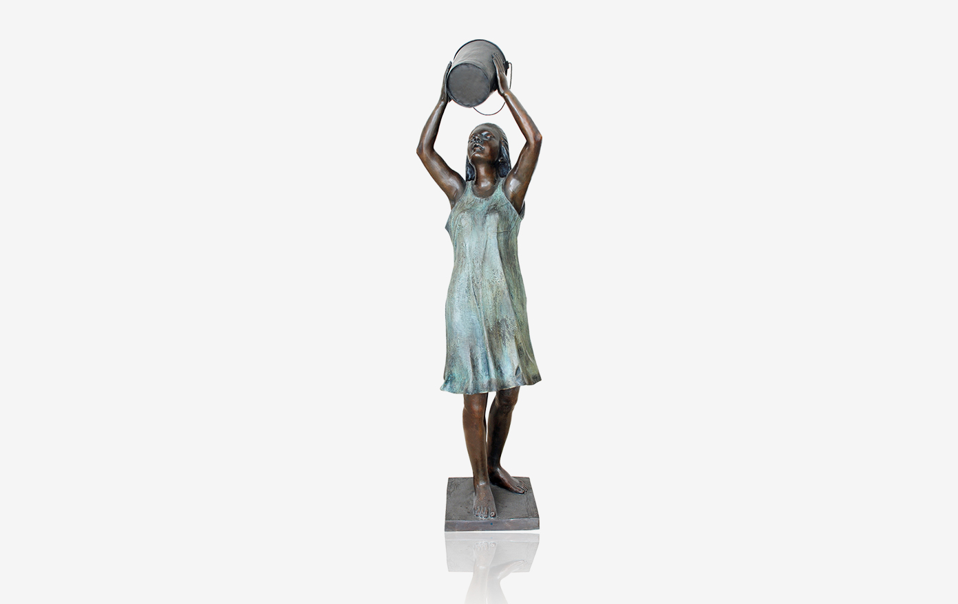 这是一件人物喷泉雕塑。这件作品主要雕刻了一个举着木桶,做着冲凉姿势的女人。而当喷泉开启之时,水流便会在桶里面慢慢汇聚,最后像倒水一样,水流会从中流出,顺着女人的长发留下。因此,这件作品的设计可谓是匠心独运,结合着喷泉的水塑造了生动有趣的生活场景。而在其他的方面,比如整体构造上,女人的双臂弯曲,形成稳固的支撑,确保了雕塑构造的稳定。而女人的五官雕刻、衣裙的褶皱、脚趾等雕刻得十分细致逼真,令人感觉眼前的雕塑仿佛是真的一般。