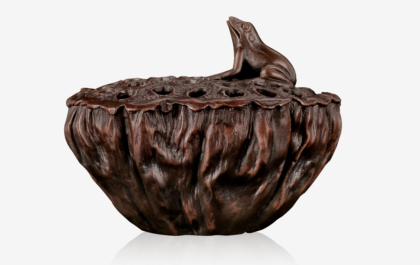 “莲”在传统文化中,寓意着“多子多福”。作品运用多子莲蓬的特点,制成熏炉造型,可谓是匠心独运、巧夺天工。而在莲蓬熏炉之上,一只青蛙昂首而坐,更是将常见的自然场景定格、聚焦,展现了大自然的和谐,在吞云吐雾的缭绕间更显人间仙境。
