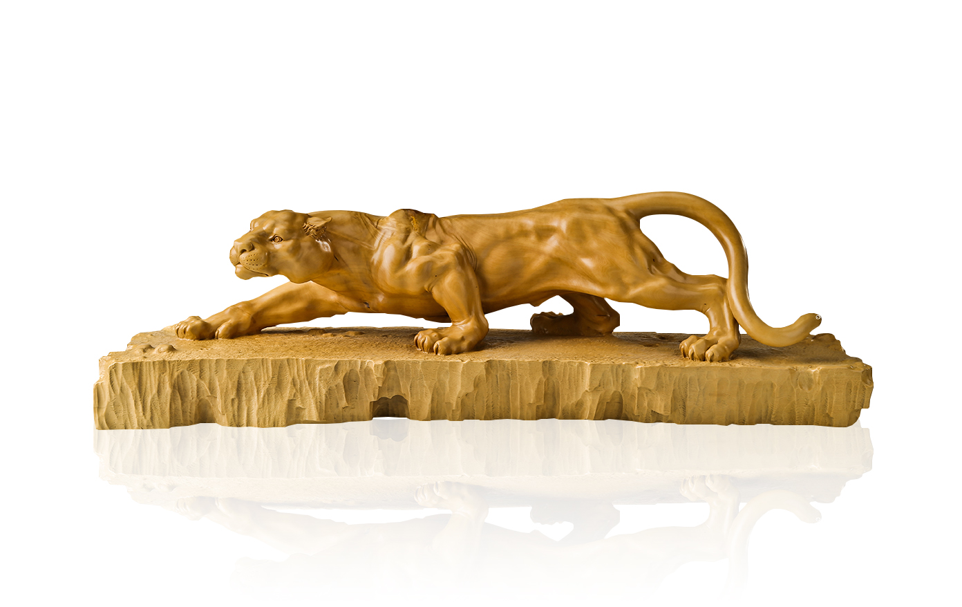 This work portrays a lifelike leopard. This cheetah lies on the ground with its limbs extended and its long tail stretched. The center of gravity of the whole body is very low. Its limbs are slender and powerful, and its muscles swell, as if it contains infinite power. Its eyes are directly on the front, embarrassed, it seems that it has already aimed at the prey, and is preparing to start a fierce fighting.