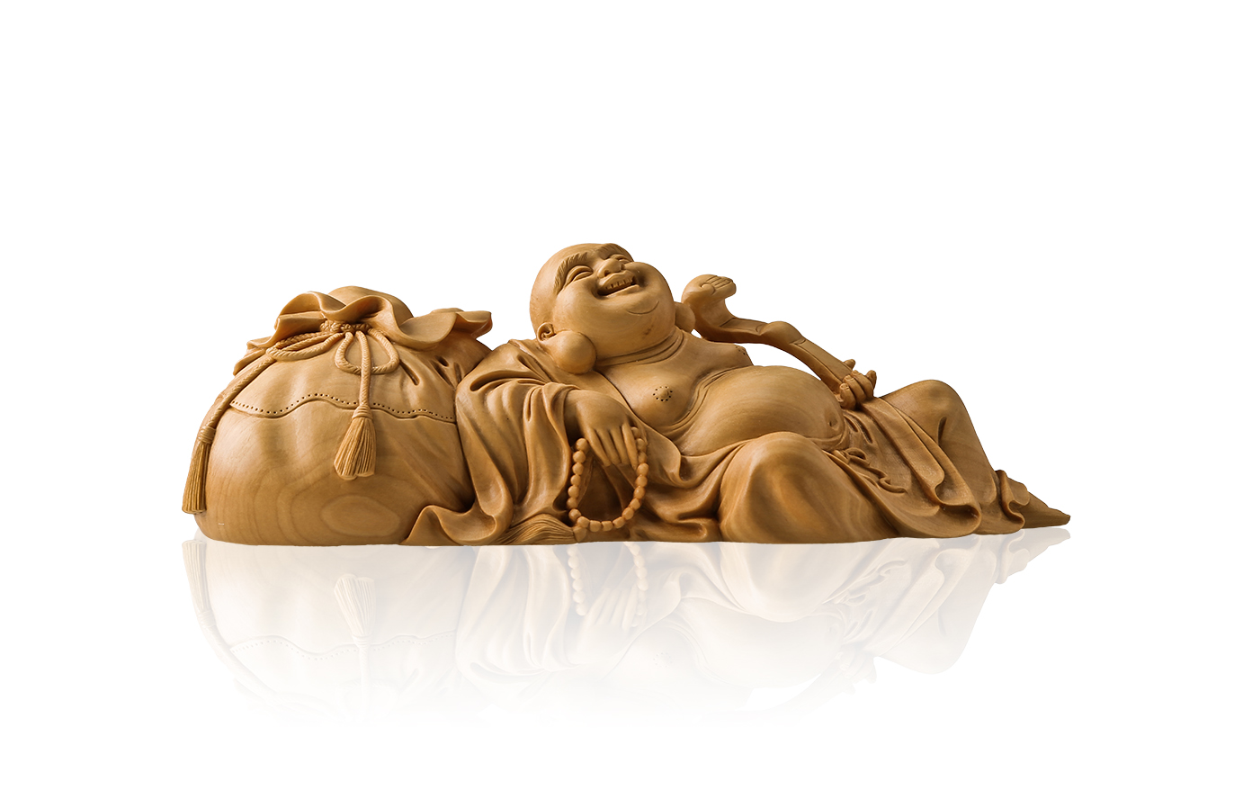 The work carved a monk lying next to the bag. The monk was smiling, lying casually and unrestrained. The work is very detailed, and the monk's eyebrows and teeth are clearly visible and lifelike. The monk holds Ruyi in his left hand, which means that everything is going smoothly, and good luck; the right hand holds a bead, which means good, healthy and longevity. The bag next to him was very full, and it had a beautiful meaning of being perfect.