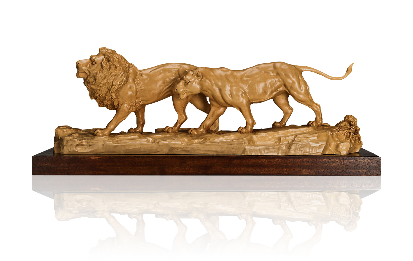 "Poetic Love" carved a picture of two lions walking together, with the male lion in front and the lioness following behind the male lion. Both lions are vividly portrayed, and the body's muscle texture, movement, and expression are fully restored by the author using the boxwood material. Especially the thick hair between male lions' necks, each one is delicately and smartly portrayed, mixed and not chaotic, with clear texture, which shows the author's profound carving skills.