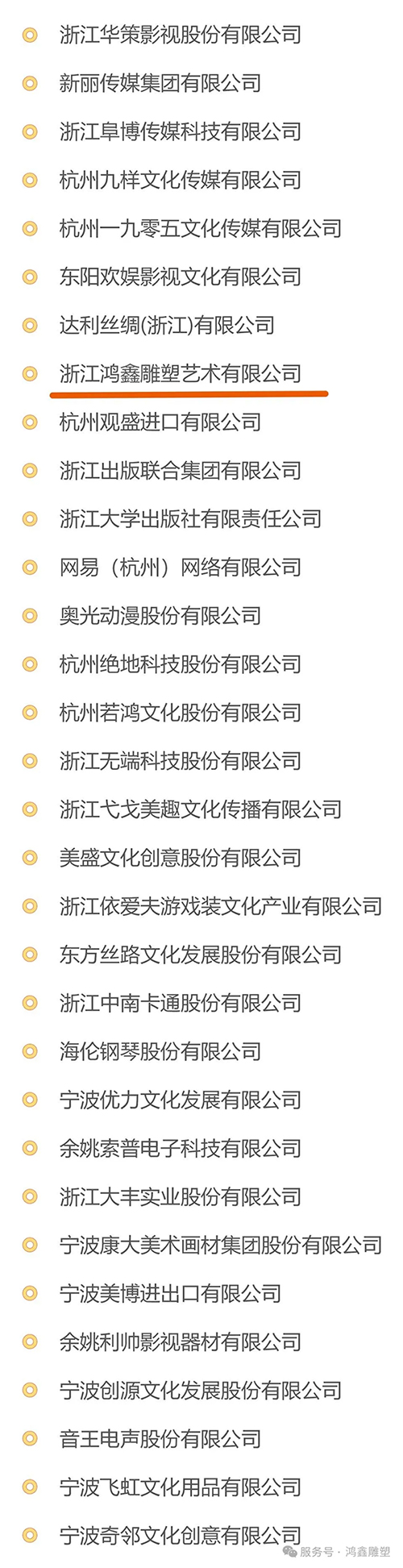 近日,商务部、中央宣传部、文化和旅游部、国家广播电视总局联合公布了2025—2026年度国家文化出口重点企业和重点项目名单。浙江鸿鑫雕塑艺术有限公司成功入选国家文化出口重点企业,标志着公司在国际文化市场中的影响力和品牌力迈上了新的台阶。