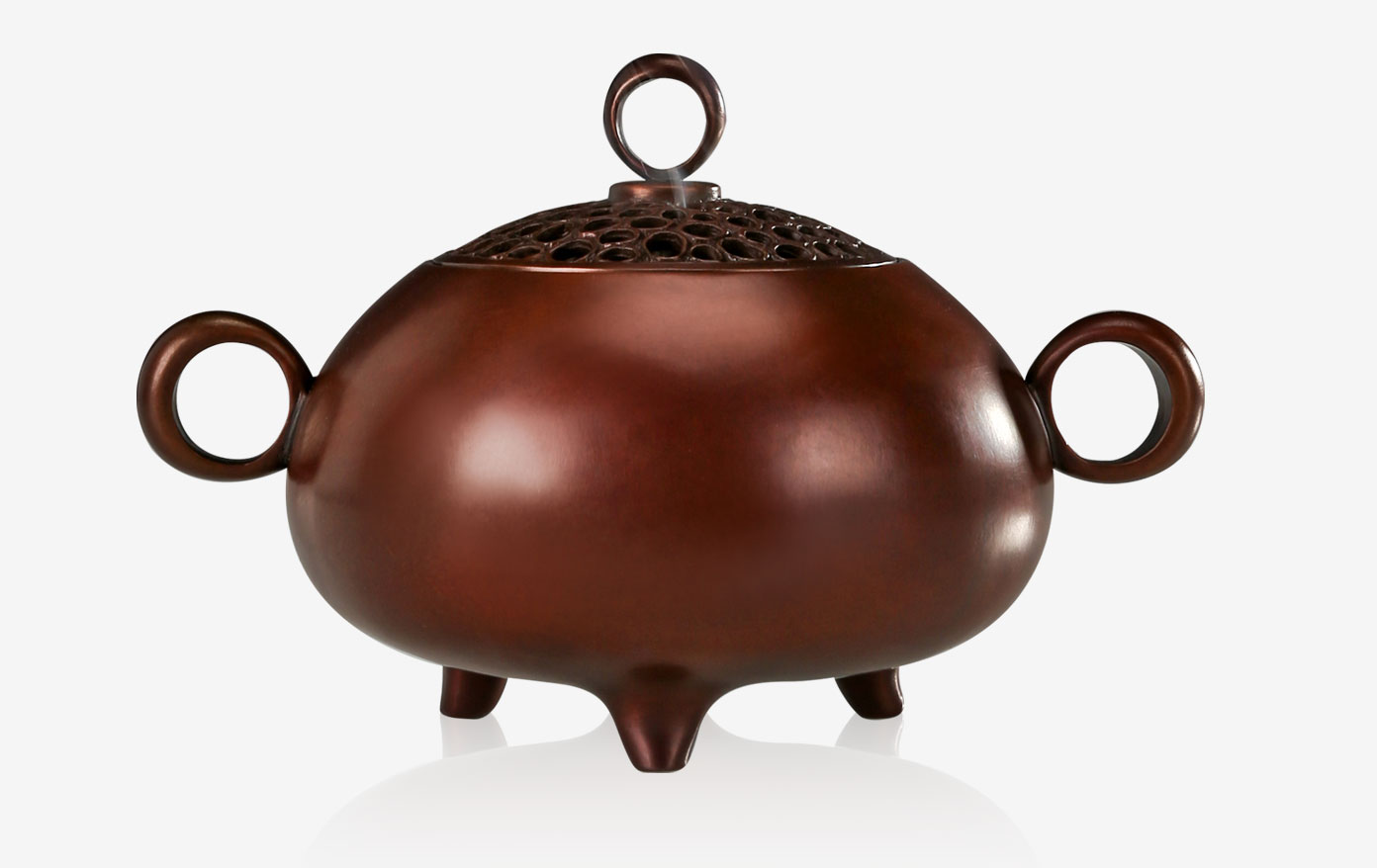 作品刻画了上、左、右三个圆环,上为髻、左右为耳,让原本单调的香炉有了“人”的特征。同时,在传统文化中就有“三生万物”的说法,三个圆环既在造型上方便提携,更寓意着“圆满”,寓意着万物生生不息,寓意着“不忘初心,方得始终”。