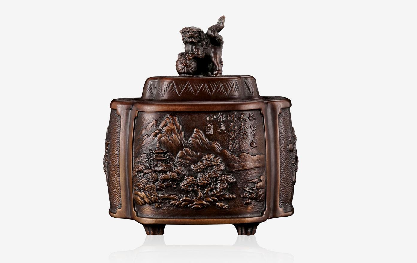 作品取材传统山水画的精髓,以精雕细琢的雕工,刻画了一幅错落有致的山水壁画。而在香炉的顶部,作品以狮兽为钮,刻画了“狮子戏球”的传统纹样,体现“百兽之王”的威严与权威,狮子凌驾于山水之上,一动一静,既充满趣味,又彰显王者风范。