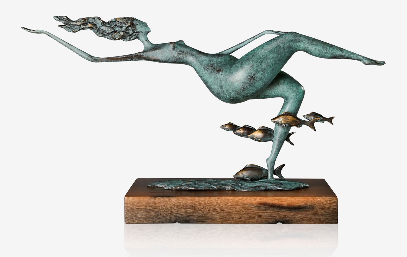作品取材自“游刃有余”,女子脚边的一群游鱼说明了场景是在水中,通过女子的姿态可见她正在游泳,而她仰泳的姿势和手脚四肢的摆动,更凸显了她“游刃有余”的轻松惬意。