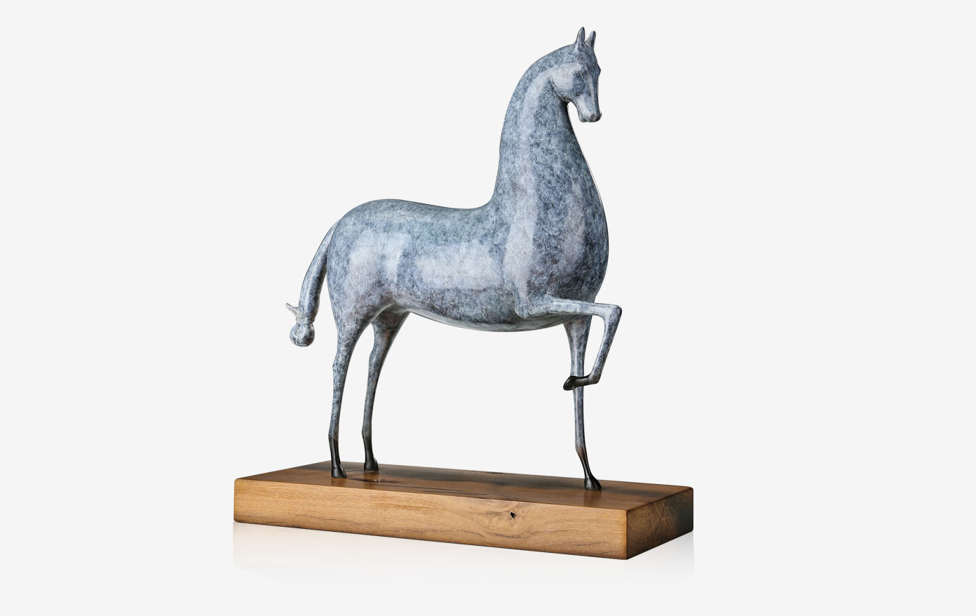 马在国内外的艺术形象中,都代表了奋进向上,作品刻画了一匹正扬蹄前行的马,不过这匹马不是疾驰如飞而是闲庭信步,既突出了奋进的主旨,更突显了马扬蹄之际优美的姿态、健美的体态。