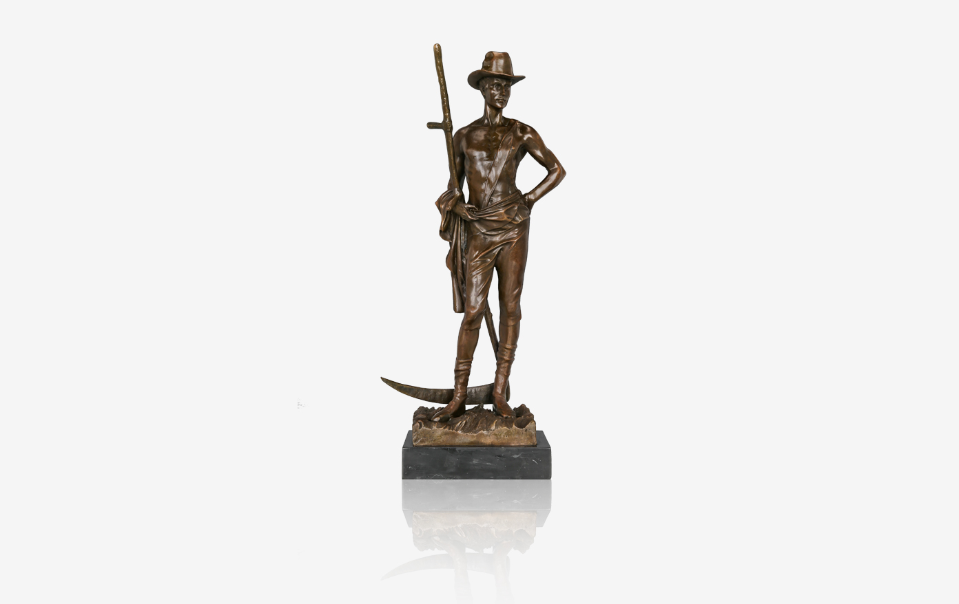 作品雕刻了一位站立在农田土地上的男子,男子仿佛刚刚结束了农事劳作,望着田地,脸上略微有些疲惫。男子的身材修长瘦削,裸露的上半身肌肉雕刻得非常真实。男子的右手扶着一根巨大的镰刀,给人以很大的视觉冲击力。
