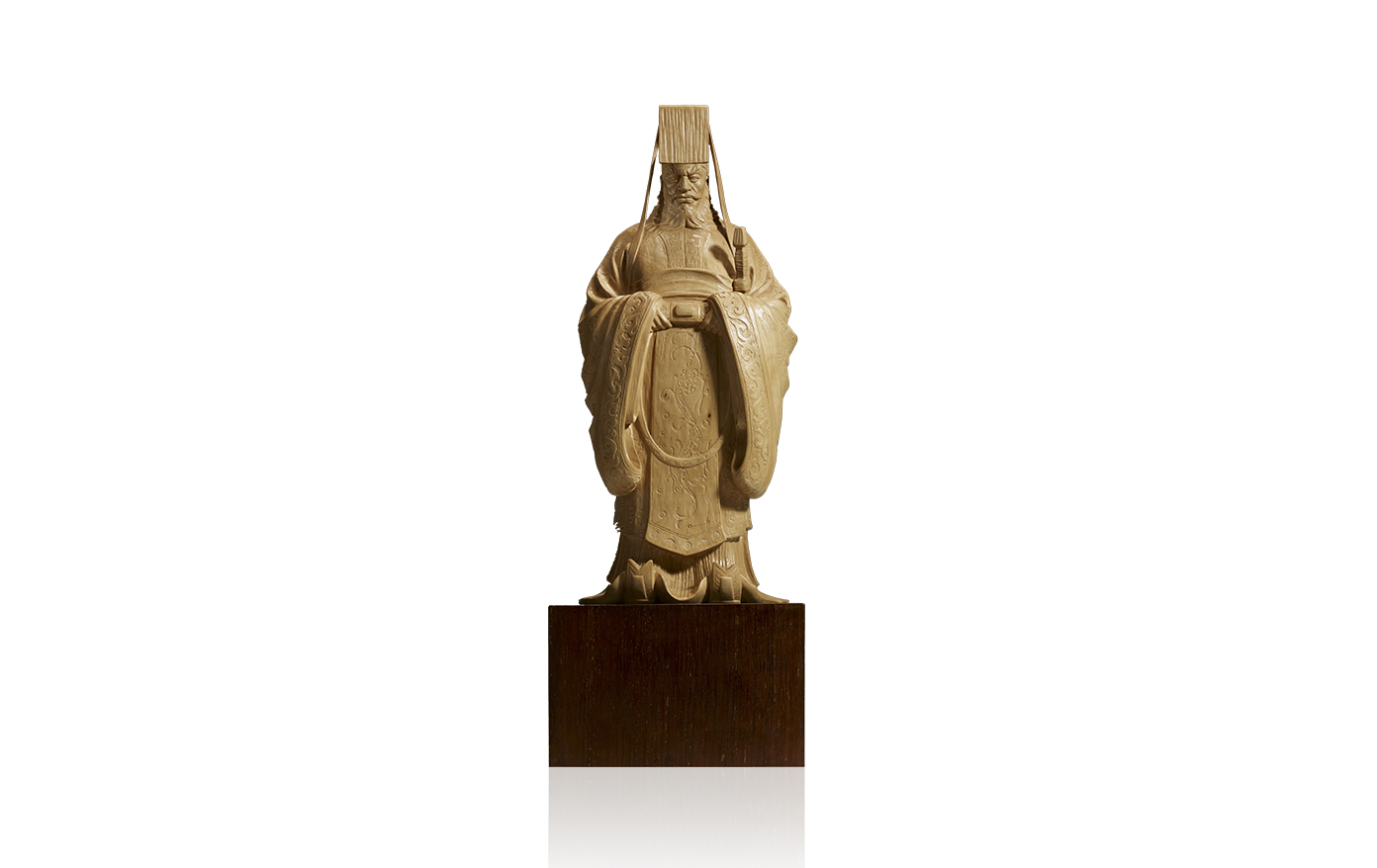 秦始皇嬴政(前259年—前210年),秦庄襄王和赵姬之子。他是中国古代政治家、战略家、改革家,首次完成中国大一统的政治人物,也是中国第一个称皇帝的君主,奠定了中国两千余年政治制度基本格局。作者通过黄杨木雕的细腻雕刻,还原出了站着的威严的秦始皇,作品雕刻得生动自然、栩栩如生。