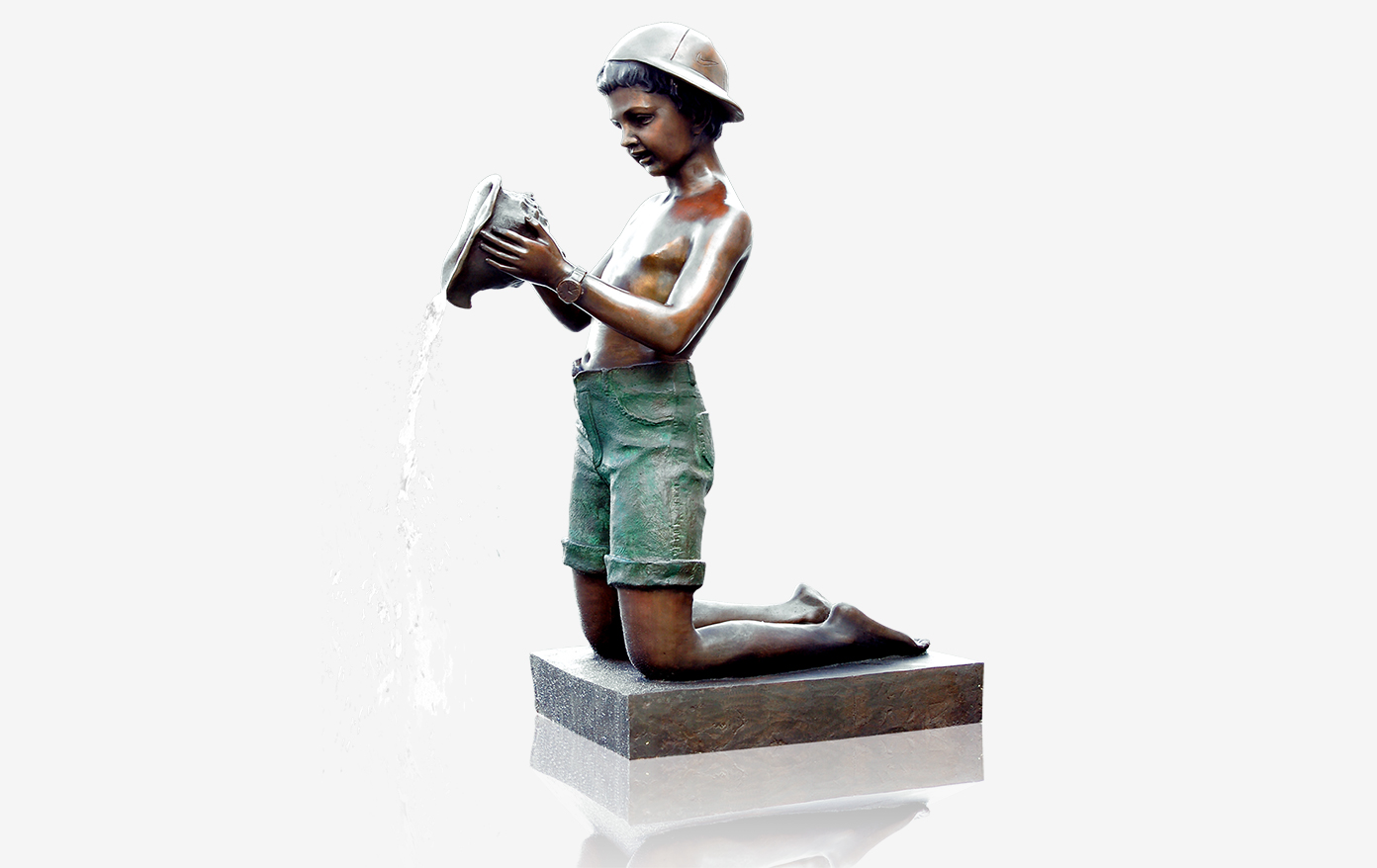 这是一座人物雕塑,男孩正跪坐在地上,只穿着一条牛仔短裤,正在倒着水,非常生动地捕捉了日常生活的亮点。男孩半裸着上半身,露出的皮肤塑造得十分地光滑细腻。特别是男孩的手腕上面的一块表,在细节的雕刻上也显得十分地认真。男孩的下半身身着牛仔短裤,一般来说,铜雕要雕刻成这样质感的牛仔裤,对技艺要求是十分严苛的。由此可见,这座雕塑的雕刻者的匠心独运。整体上,采用“L”造型,十分适合雕塑的内容,呈现出一种灵动活泼的气息。