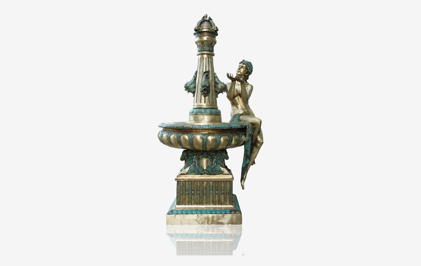作品将常见的喷泉雕塑造型与人物雕塑相结合,形成了种全新造型的喷泉雕塑。一名女子坐在喷泉的平台上,伸出双手望向上方,仿佛是在祈求着什么。当喷泉开启,泉水流下,顶端出水口的泉水将会进入女子的双手,女子正是在望着流下的泉水,并伸出双手去接,因此女子的祈求谜底也就会揭开了。而在作品的细节雕刻上,女子的体态雕刻得十分完美,用铜雕的材质表现出了皮肤的润滑的质感。此外,喷泉雕塑上面雕刻的鱼、鸟头和羊头都十分精致。