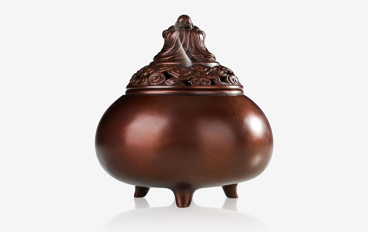 在佛教文化里,弥勒佛是未来之佛,寓意着美好的明天,“开口便笑”、“大肚能容”是其在民间传说中的重要形象特征。作品顶部刻画了一尊“笑弥勒”,正是笑纳八方;而底座的香炉造型,更是寓意弥勒佛容阔四海,与香炉产品实用性相得益彰。