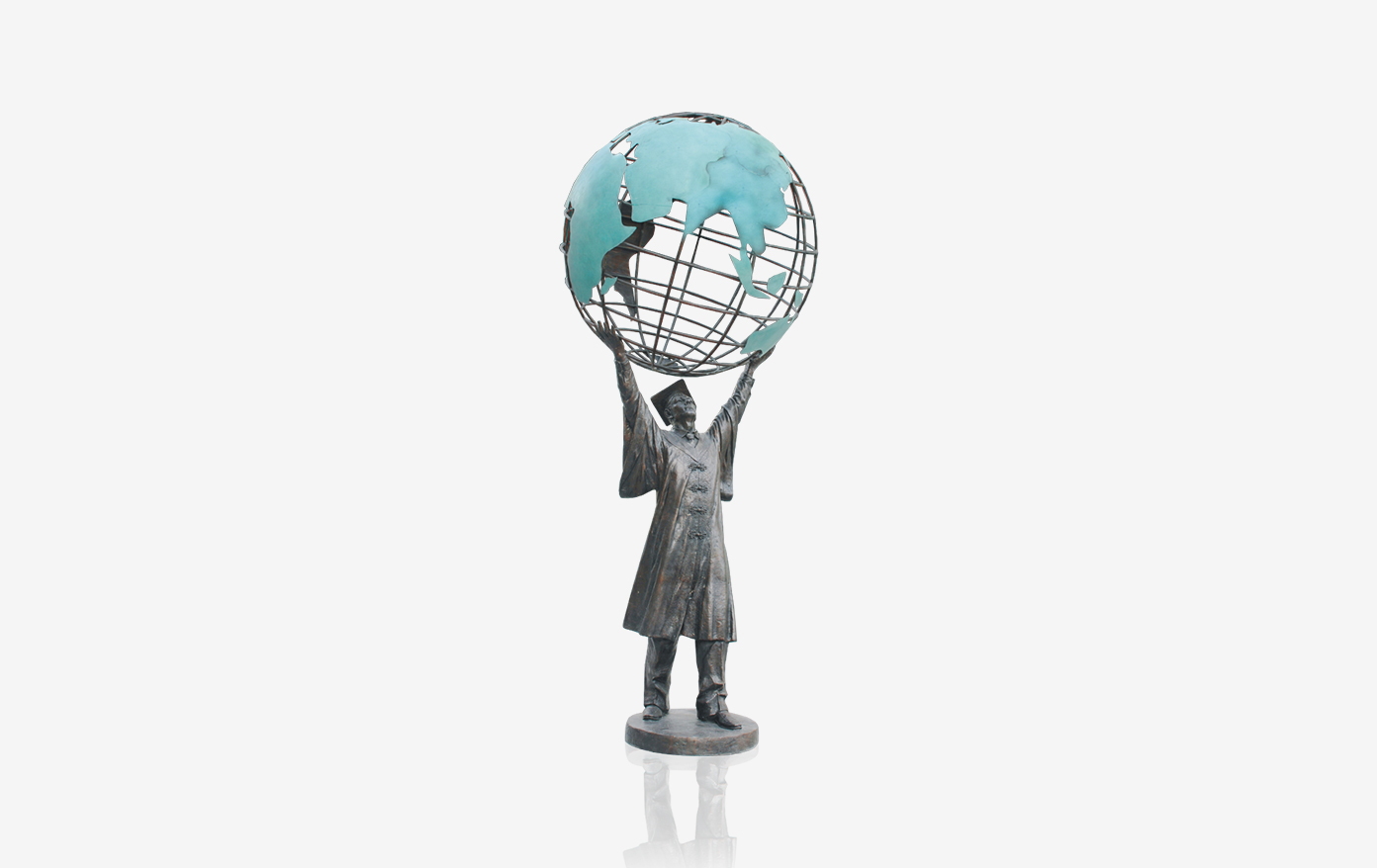 这座雕塑雕刻了一个托举着地球模型的男人,男人身着学士帽和学士服,昂首站立。在他的头顶上,一道道经纬线与青色的大陆组合成微缩版的地球。寓意学无止境,启示学习是人类发展前行的重要途径。这是一件非常有哲理意味的作品,适合放在校园中。