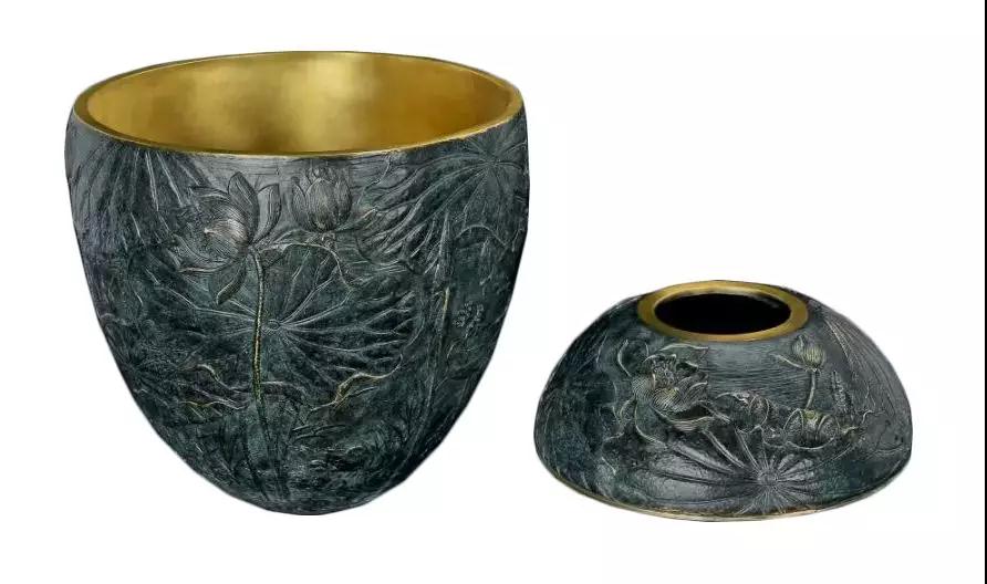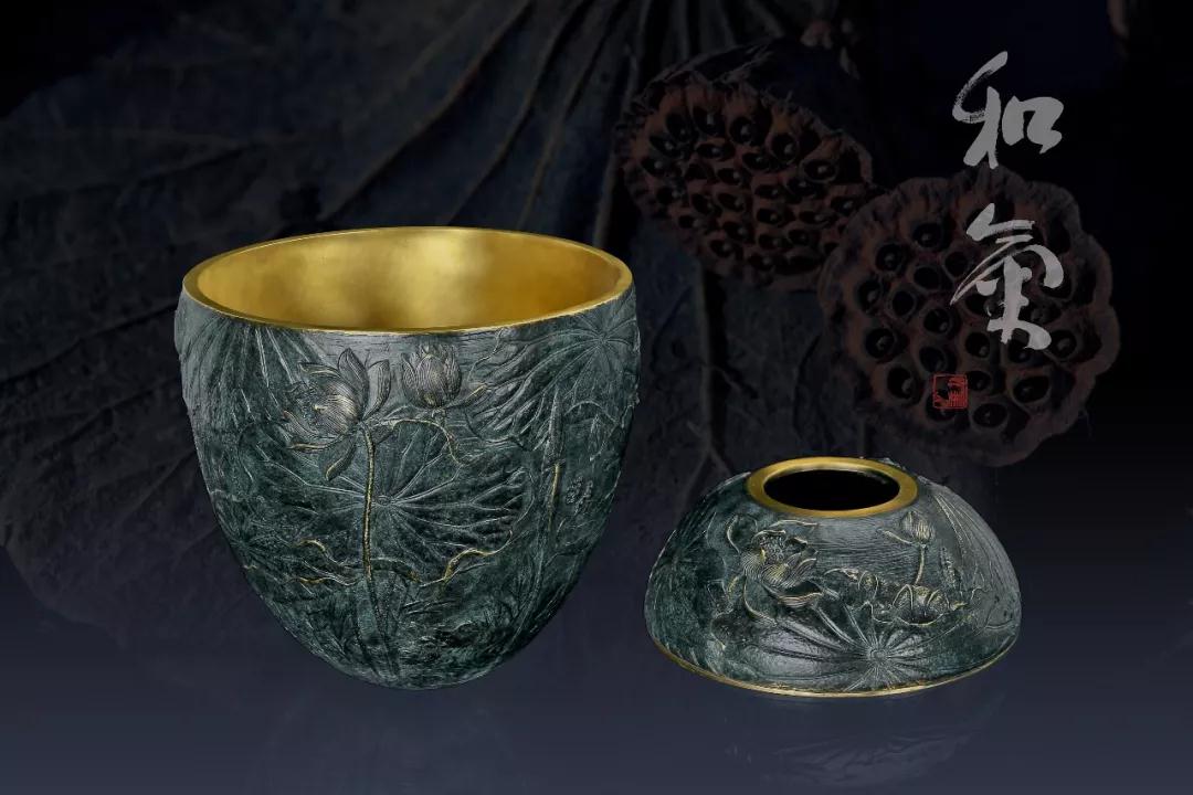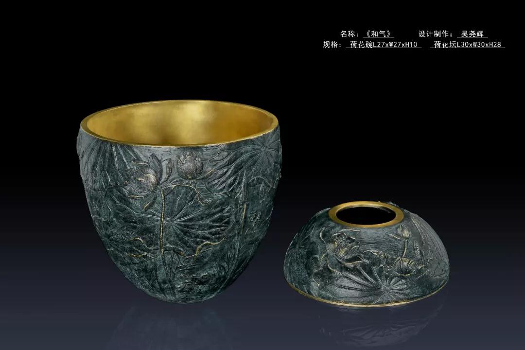 《和气》中,最吸引人注意的便是铜器面壁上以荷为主的浮雕设计,曲线精细而流畅,质感凹凸而有致,与陶瓷品形成鲜明的对比,令人一见便心生喜爱。荷花秀挺、荷叶舒展,或袅娜、或羞涩、或热情,仿佛是一片荷的盛境,令人沉醉。