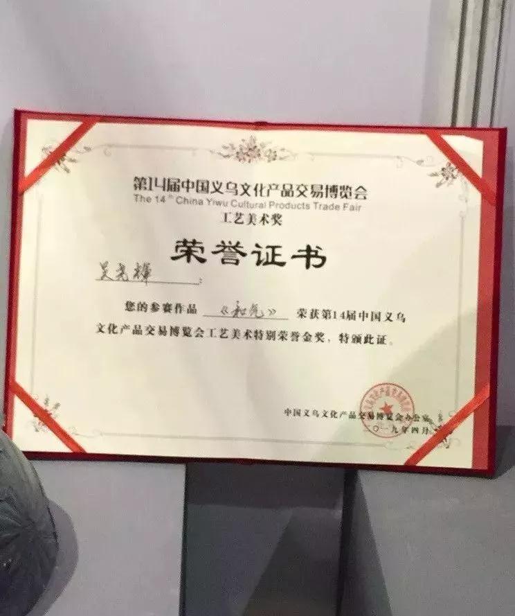 《和气》是吴尧辉大师的匠心之作,前后荣获了两个工艺美术领域的奖项,一为2019年第14届中国(义乌)文化产品交易会工美艺术特别荣誉金奖,一为2019年浙江·中国非遗博览会非遗薪传奖传统工艺大展“优秀奖”。
