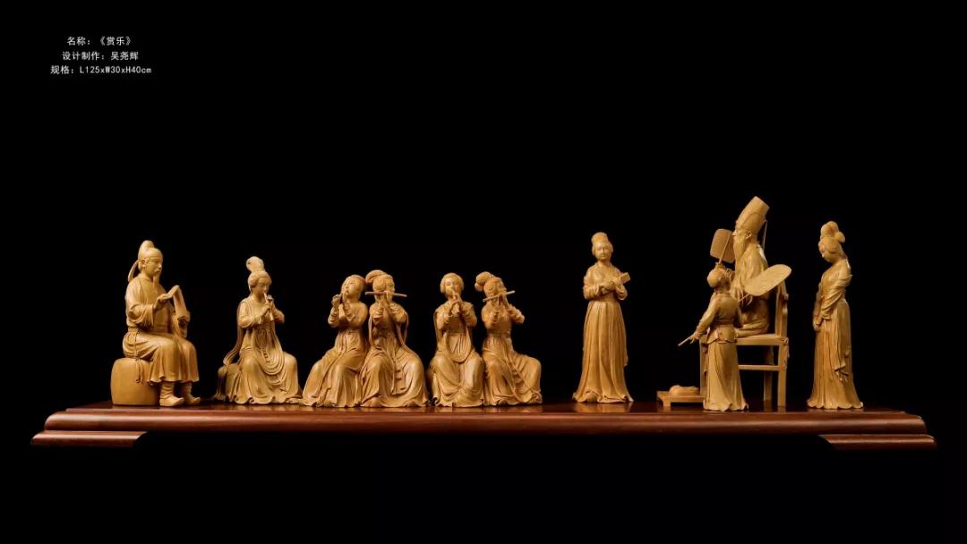 在中国工艺美术大师吴尧辉独创黄杨木长卷下,生动雕琢出一幅赏乐的精彩场景。温润稳固的黄杨木雕赋予画面独到的传神意象。作品虽是雕塑,《赏乐》却能够画面灵动,每一个人物在作者对美的诠释间,分外传神。雕塑空间布局与奏乐时位置相应,人物线条遒劲流畅,神态也沉醉在美妙的旋律间。