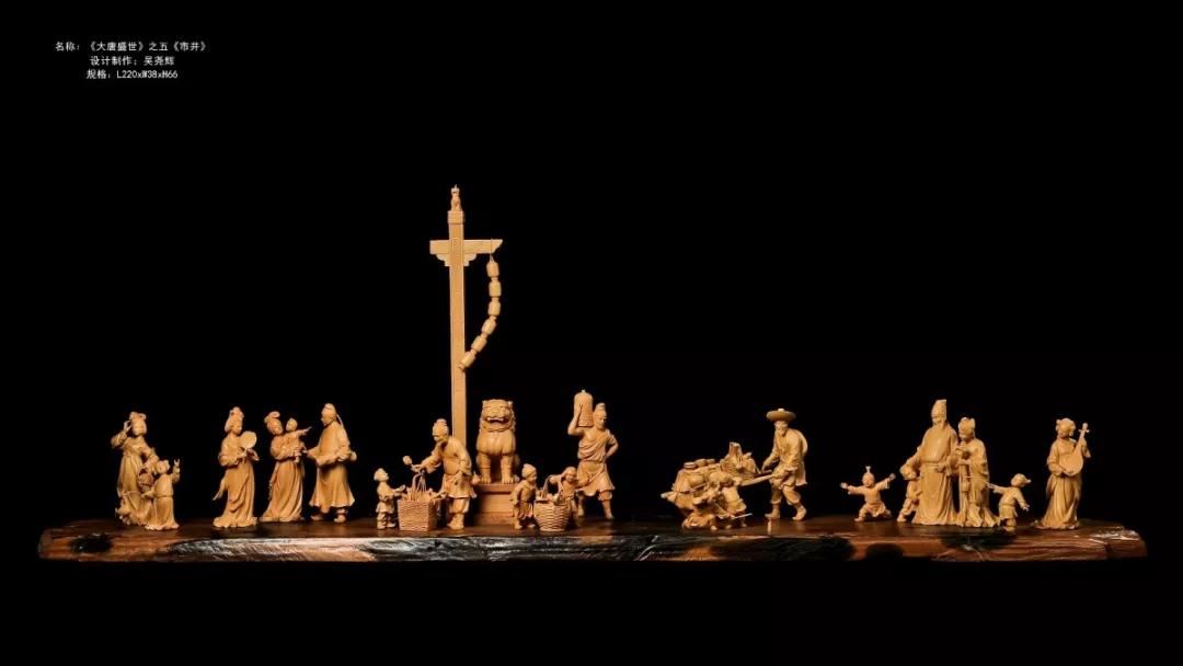 作品将市井人物及场景的雕塑按空间逻辑的设计放置在整块木板上。黄杨木雕做出了完整的盛世长卷画面,《大唐盛世》之一“市井”画面鲜活地将市井人们其乐融融的生活场景极尽描摹。人物角色各异,雕塑空间布局严谨,人物身体线条遒劲流畅。细看之,每个人的神态不同、衣饰各异,发髻和簪花也不尽相同。